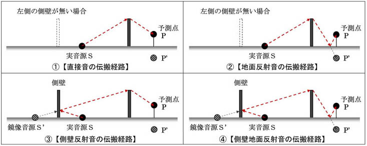平面道路において音源の両側に遮音壁を設置した場合は、(反射面が平坦で十分大きい場合には)直接音に加え地面反射音と側壁反射音が発生します。音の伝搬経路としては図-1に示す4経路が考えられます。